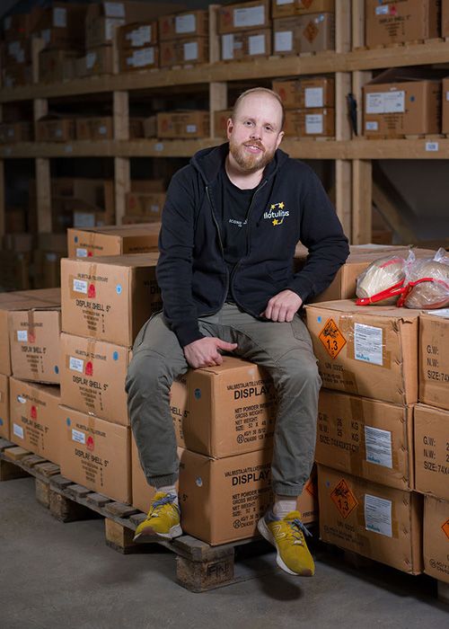 Olen työskennellyt Suomen Ilotulituksen palveluksessa reilut yhdeksän vuotta, kohdallani lähestyy kymmenes uuden vuoden sesonki. Pääsääntöisesti teen työt kotitoimistolla Oulussa, jonka lisäksi vastuullani on myös Oulun varaston hoito.